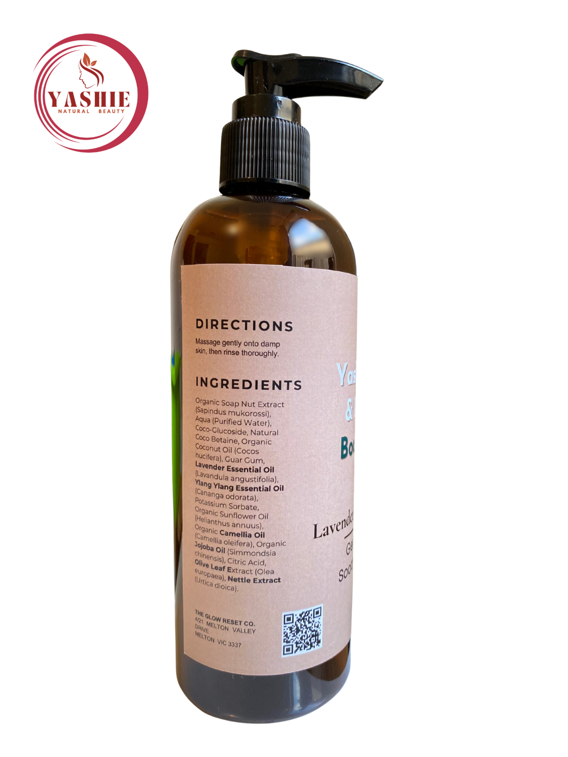 Ingredients: Organic Soap Nut Extract (Sapindus mukorossi), Aqua (Purified Water), Coco-Glucoside, Natural Coco Betaine, Organic Coconut Oil (Cocos nucifera), Guar Gum, Lavender Essential Oil (Lavandula angustifolia), Ylang Ylang Essential Oil (Cananga odorata), Potassium Sorbate, Organic Sunflower Oil (Helianthus annuus), Organic Camellia Oil (Camellia oleifera), Organic Jojoba Oil (Simmondsia chinensis), Citric Acid, Olive Leaf Extract (Olea europaea), Nettle Extract (Urtica dioica).